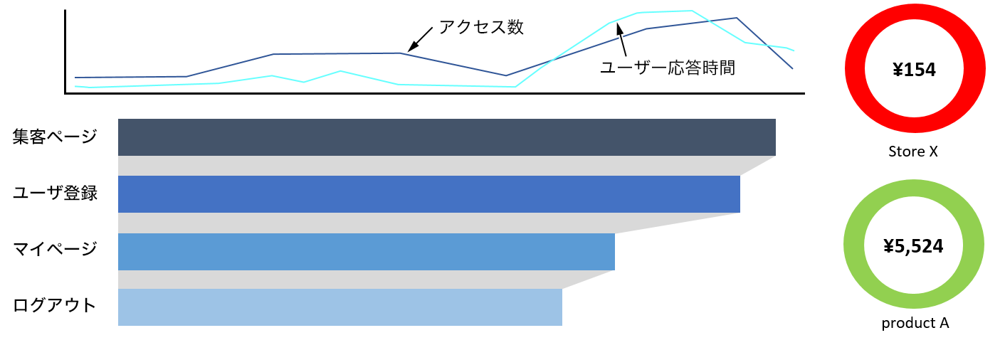 サイト訪問者の流入数や属性の把握だけでなく、アクセス数と応答時間の相関や個別ユーザのサイト上の行動とその際のページ表示時間を迅速に把握できます。また、コンバージョン率や、製品や店舗毎の売上状況をリアルタイムで把握でき、性能劣化が売上にどう影響しているかを可視化。システム部門だけでなくビジネス部門とビジネスパフォーマンス状況を迅速共有できます。