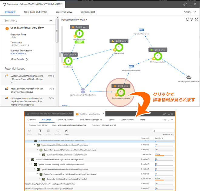 ECサイトや企業の基幹システムなどビジネスの収益に直結するトランザクションを全てモニタリングし、スローダウンしたトランザクションを迅速に抽出します。また、問題の有ったトランザクションはアプリケーションのソースコードレベルまでドリルダウンし、問題の詳細を特定します。