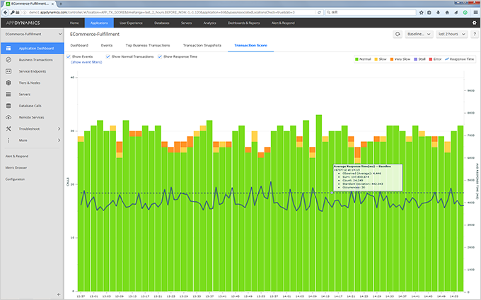 エージェントが計測したデータから繁忙期や閑散期だけでなく四半期や曜日による傾向などシステムの利用状態を機械学習し、動的なベースライン(閾値)を自動作成します。収集する全てのバラバラなビジネストランザクションも自動的に紐付けるので、どのビジネス(業務)がいつもより応答が劣化しているかなどモニタリングを始めて直ぐに把握する事が出来ます。これら導入時の初期設定工数が大幅に削減され直ぐにシステムの状態が可視化出来ます。