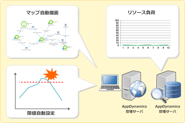 従来の監視システムは、監視データの管理サーバやデータ蓄積の為のデータベース、レポート出力やデータバックアップの為にいくつものハードウェアが必要でした。 しかし、AppDynamicsはそうした管理サーバもクラウド上で提供しています。そうする事で、エージェントから管理サーバまで全ての設備がクラウド環境で稼働する事も可能になり、監視の為の設備投資を大幅に削減できます。