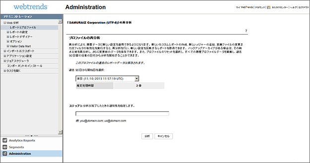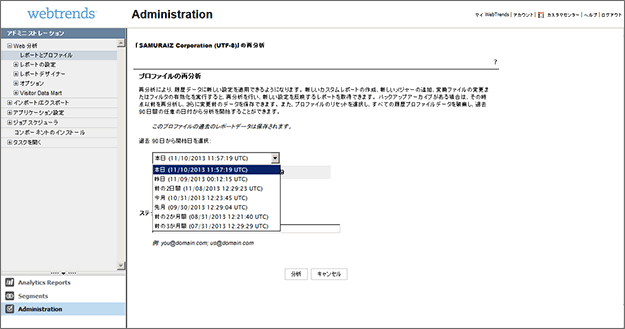 Webtrends Analytics Ondemandでは、過去上記のBの方法のみしか再解析を行う方法を持っていなかったのですが、ユーザへのサービスレベルの向上のため以下のように、再解析をユーザが直接操作できるように、UIの変更を行ってきました。