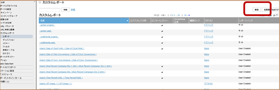 まずは Administration>Web 分析>レポートの設定>カスタムレポート>レポート とすると図1のようにレポートの一覧が表示されるので、ページ右上の「新規」をクリック。