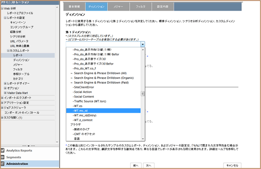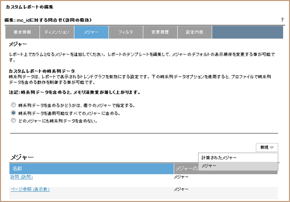 まずはカスタムレポートのベースとなる測定対象の項目と値の指定から。
