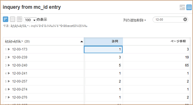実はこのディメンション、デフォルトであったものではなくて、「訪問の最後のログにinqがあったら計測する」というディメンションを事前に自分で作成してあります。でも説明が大変なので、ここでは割愛。笑