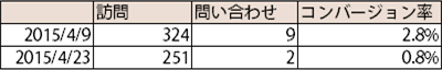 メルマガ配信日ごとの「訪問/問い合わせの数」とコンバージョン率です。