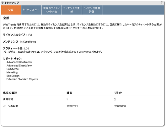 | [Administration Console]にはライセンスセクションがあり、現在使用中のアクティベーション、リミットとカレントのページビュー数が表示されます。また、同じページでメンテナンスサービスが有効かどうかの情報も表示されます。 | ||